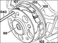 5. Поверните фланец вала задней оси (68) так, чтобы отверстие с резьбой находилось над пружиной (107).